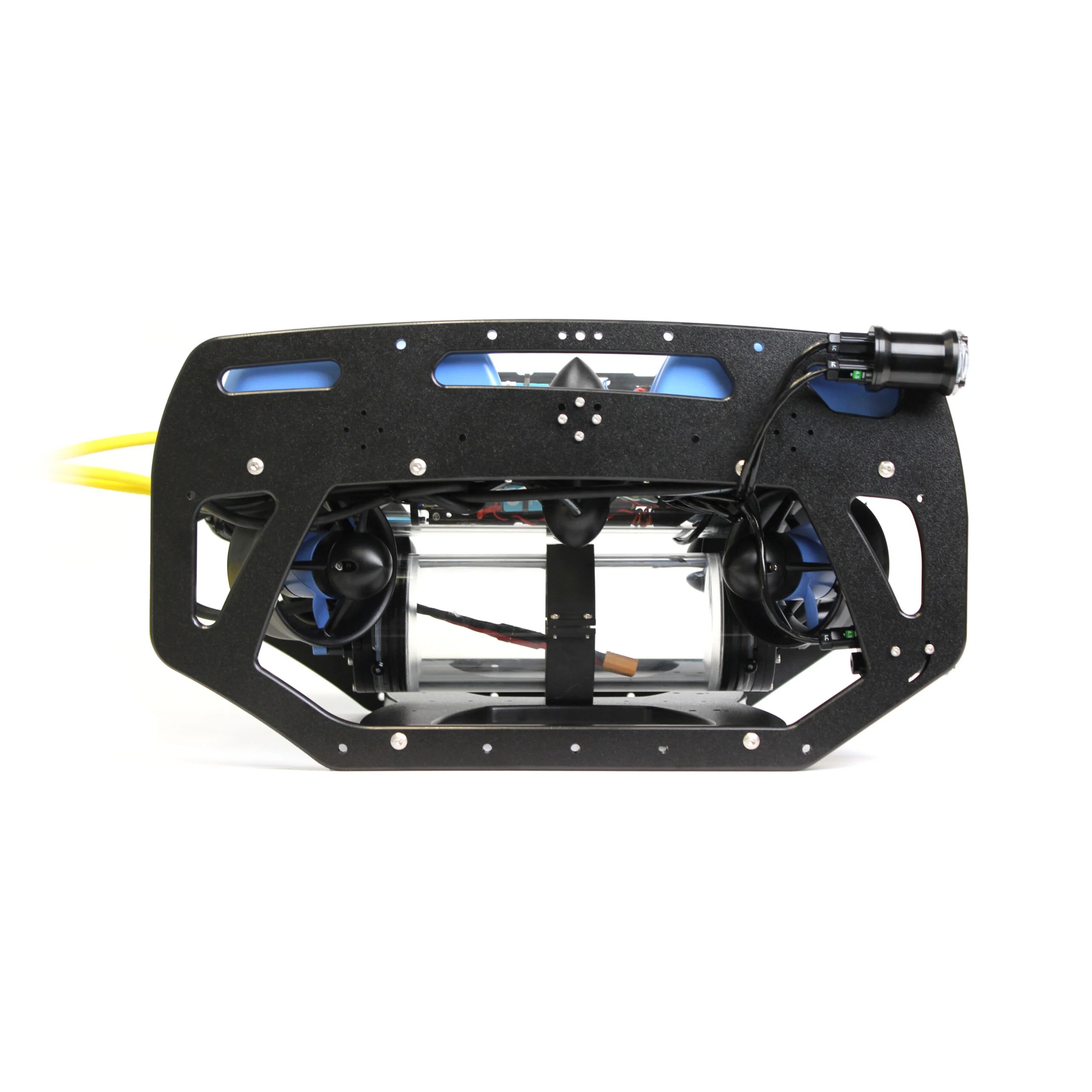 İş sınıfı veya araştırma sınıfı bir ROV gibi tasarlanan BlueROV2, ROV’un standart bileşenlerini taşıyan açık bir şasiye sahiptir. Bu sade tasarım, sağlam ve genişletilebilir olup, kıskaç veya tarama sonarı gibi ek aksesuarların takılmasını kolaylaştırır. Ayrıca, şasiyi daha da genişleterek ek pil muhafazaları gibi daha büyük yükler için daha fazla alan sağlayan bir yük kızak da sunuyoruz.